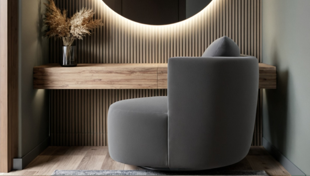 Stylowy fotel Aston z obrotową podstawą łączy funkcjonalność i wygodę. Ergonomiczne siedzisko, szeroki wybór modnych tkanin i kompaktowy design sprawiają, że idealnie pasuje do każdej sypialni i małych przestrzeni.