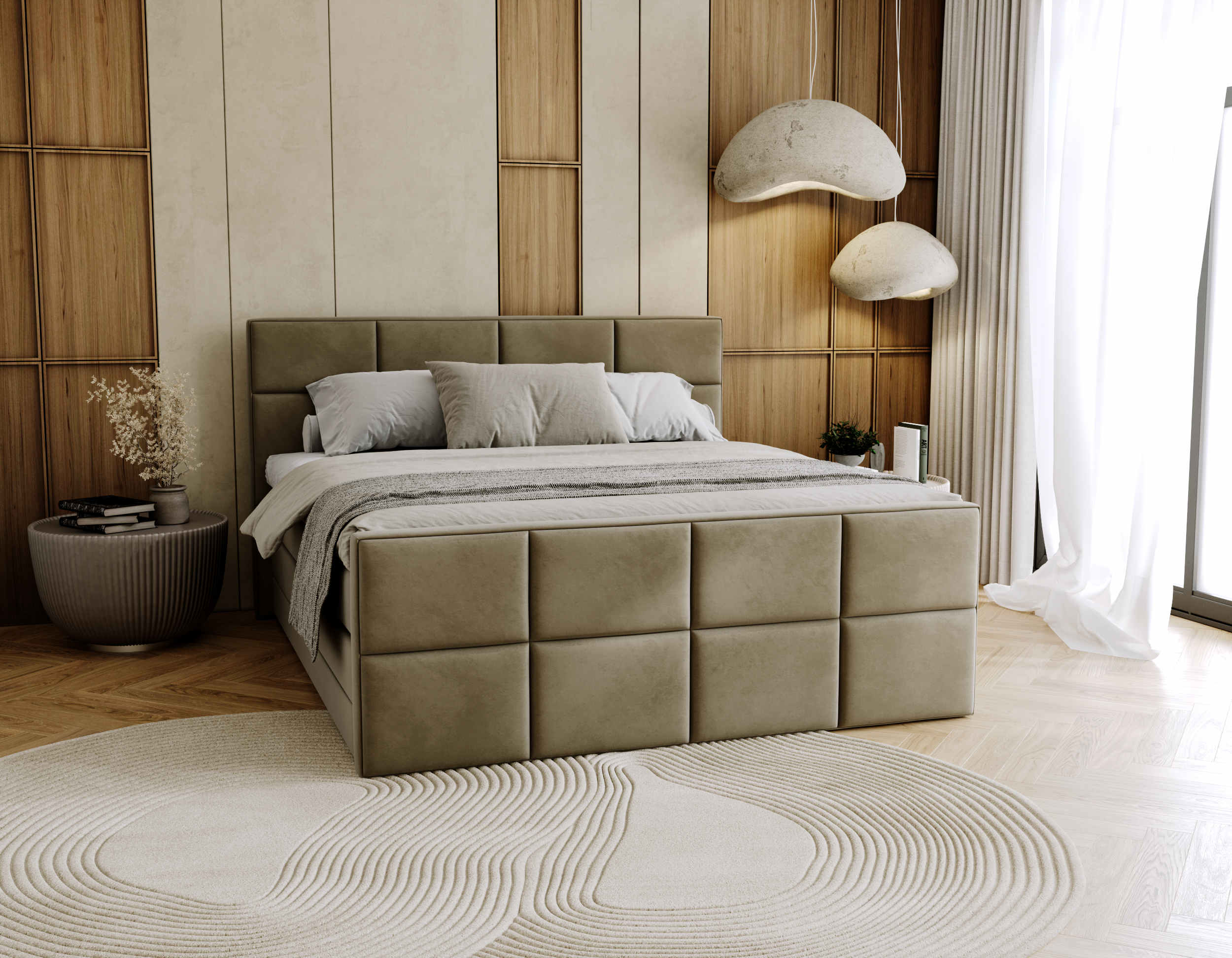Odkryj nowoczesny design z łóżkiem Calla, które dzięki swojemu wzornictwu wprowadza do sypialni wyjątkowy, geometryczny look. Łóżko Calla wyróżnia się wezgłowiem i przodem ozdobionymi wzorem połączonych prostokątów, co nadaje mu nowoczesny wygląd i niepowtarzalny styl.